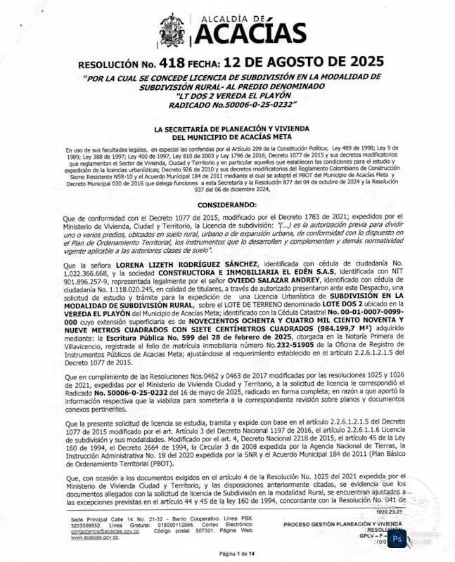 Adicionalmente, el predio en mención conocimos cuenta actualmente con la Resolución No. 418 del 12 de agosto de 2025, mediante la cual se garantiza el estricto cumplimiento y respeto de la vocación del suelo conforme a la normatividad vigente. Por eso aquí en las imágenes que acompañan este texto dejamos las claridades para que no caigan en desinformación principalmente cuando se encuentra en redes. Lo más preciso es consultar o acudir a las dependencias oficiales, en este caso del municipio, para conocer claramente lo que se está actualmente desarrollando en materia de vivienda en la ciudad de Acacías.