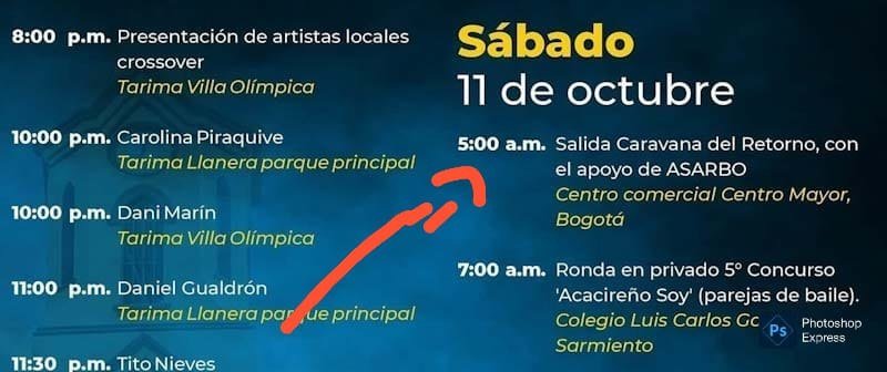 Estaba en la programación del festival. Que se iba a realizar la tradicional caravana del Retorno que sale desde Bogotá. A pesar de las dificultades actuales en la vía se dejó como hecho que hoy, sábado 11 de octubre, saldría la caravana desde Bogotá, evento coordinado por César Rey, con Asarbo, la reconocida Asociación de Acacireños residentes en Bogotá. ( Ver imágen en esta publicación)